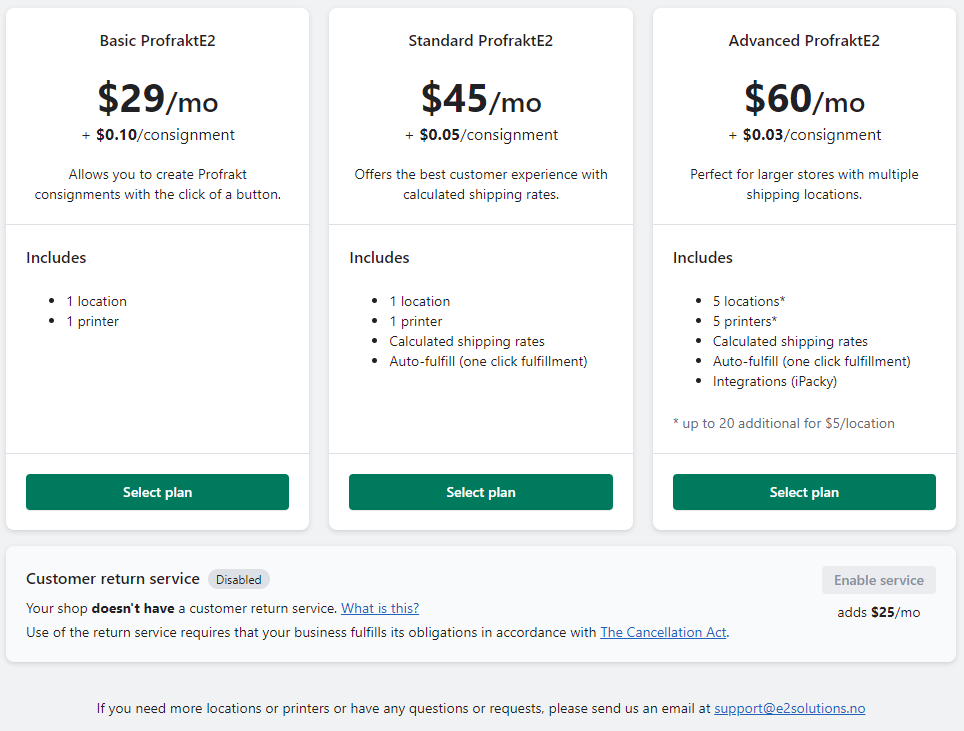 "For å bruke appen på best mulig måte, må du ha Carrier Calculated Shipping aktivert. Fås ved årlig betaling, ved å kontakte Shopify og betale $20/mnd, ELLER å bruke Shopify Advanced eller høyere."